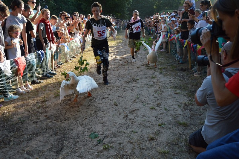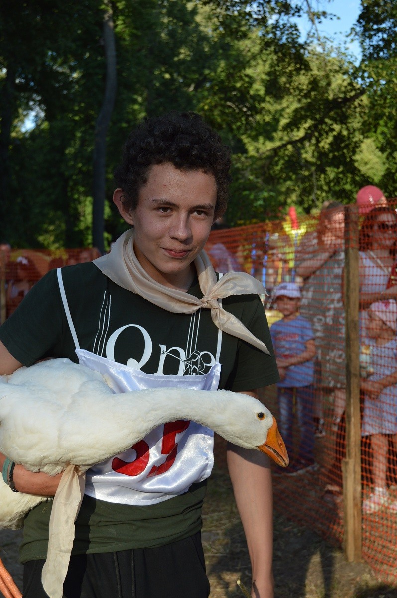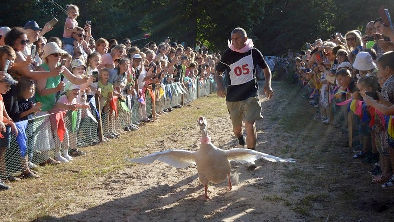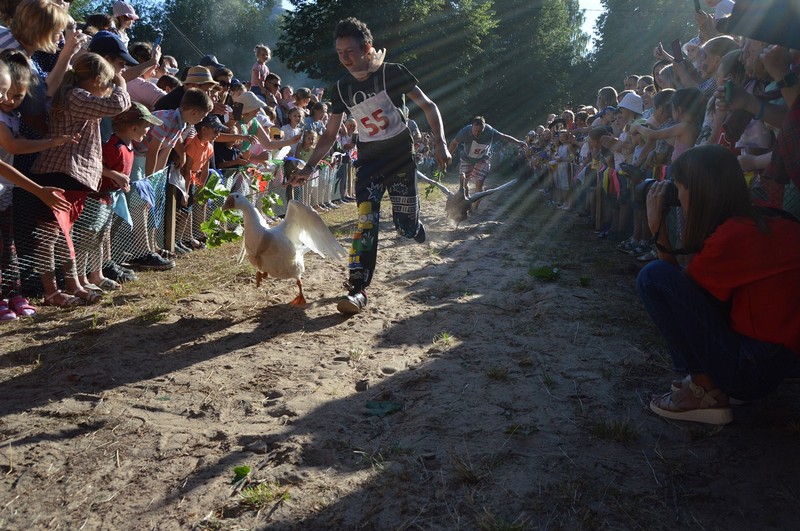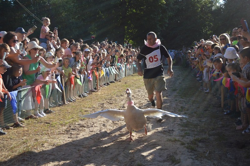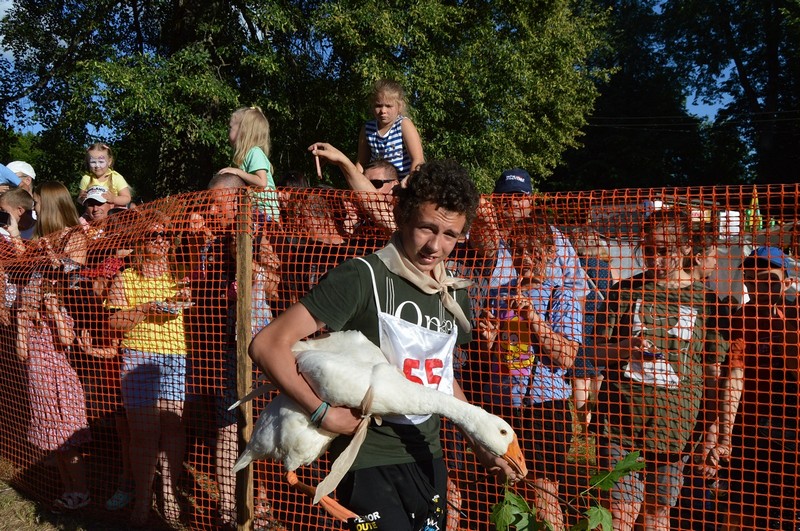Главным событием стали, конечно, традиционные гусиные бега. На дистанцию вышли 8 участников со своими хозяевами. Подгоняя птиц ветками, спортсмены упорно бежали к финишу. В этом году в финал вышли Евгений Казневский с гусем Жориком (Гусь-Железный) и Антон Юдин с Мартином (Шостье). В упорной борьбе победу одержал Мартин.