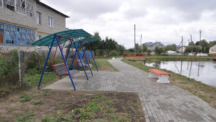 Строители вычистили ил со дна пруда, сделали склоны берега пологими, вырубили деревья и заросли. Выровняли площадку, выложили брусчаткой пешеходные дорожки, установили пять скамеек-пергол, два помоста с освещением, беседку и качели.