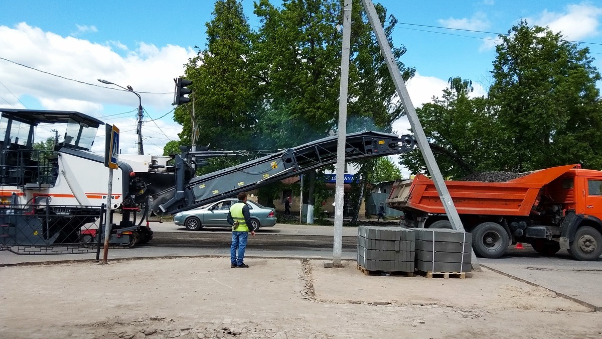 «На первом этапе мы срезаем фрезой старый слой асфальта, – говорит главный инженер Евгений Меркушов. – Сейчас здесь работают 10 сотрудников и 4 единицы техники (самосвалы, поливочная машина, которая подвозит воду к фрезе и подметает, и фреза). В ближайшие дни планируем начать укладку выравнивающего слоя».