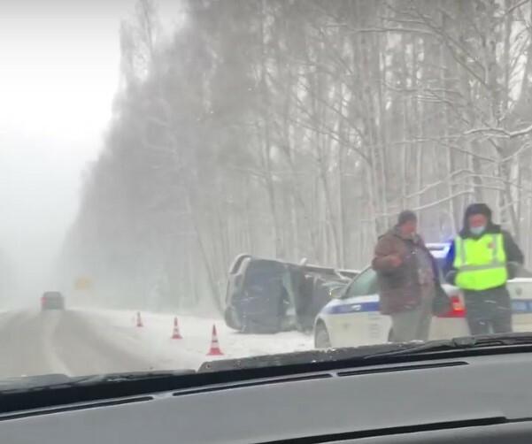 Об этом сообщил пользователь соцсети ВКонтакте. Легковушка вылетела на обочину и перевернулась на бок.