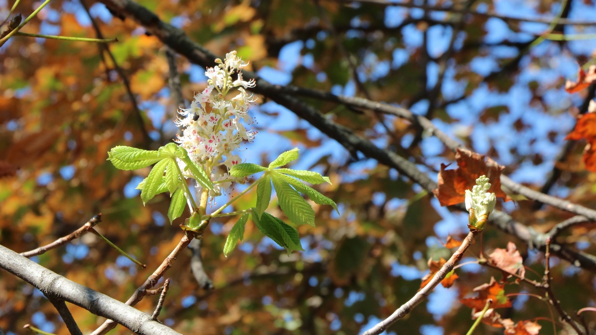 Обычное время цветения каштана – весна и лето, однако в этот раз наблюдается природная аномалия: одновременно можно увидеть на дереве и цветы, и плоды на одной ветке. При этом погода на улице вовсе не теплая: по номам столбик термометра опускается до +3.