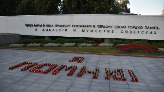 Собравшиеся зажгли свечи, огонь для которых привезли с могилы Неизвестного солдата в Москве. Из свечей выложили «Я помню». К Вечному огню возложили цветы.