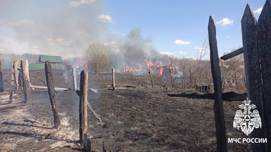 Сообщение о возгорании построек поступило в 13.10. Пожар тушат 11 машин, 25 человек, в том числе инженерная техника для подвоза воды и «Пожлес».