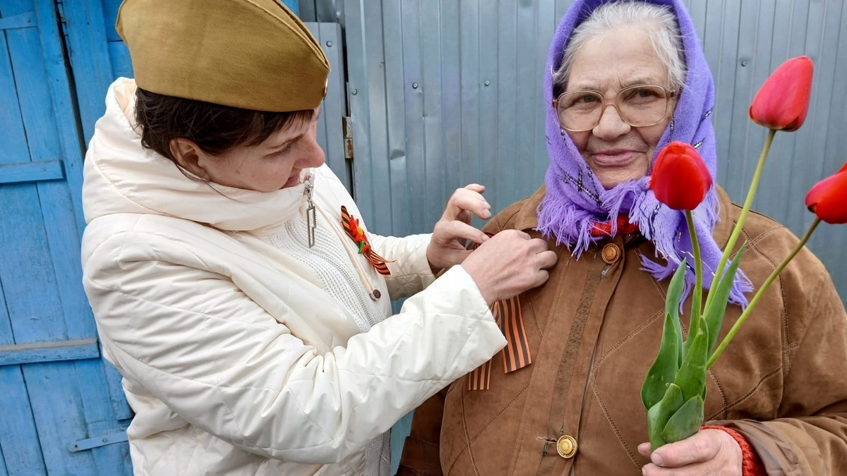 Соцработники, на попечении которых дедушки и бабушки, принесли им открытки, Георгиевские ленточки. Поблагодарили ветеранов за победу над фашизмом и восстановление страны.