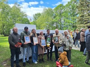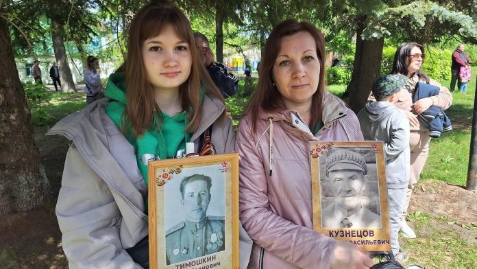 «Мы всегда несем портрет моего деда Митякова Степана Алексеевича, – продолжает беседу Сергей Сафонов. – Ему было 35 лет, когда началась война. Он ушел на фронт, а дома остались жена и пятеро детей (сын и четыре дочки, одна из которых моя мама). Дед погиб за свободу нашей страны в 1943 году в Белоруссии, под Витебском. В одном из писем он написал: «Надо бить немецких гадов. Мы скоро вернемся домой с Победой!». Сейчас это письмо хранится у моей сестры, которая живет в Курске». Горожане возложили цветы и венки к монументу Победы и Вечному огню.