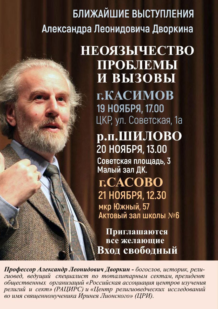 19 ноября в касимовском ЦКР в 17.00 пройдёт встреча с российским исследователем современного религиозного сектантства, историком, православным богословом и общественным деятелем Александром Дворкиным.